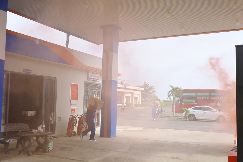 Tình huống giả định đặt ra là sự cố cháy nổ xảy ra tại khu vực trụ bơm xăng. Ngay sau khi phát hiện, đội PCCC&CNCH tại chỗ của cửa hàng nhanh chóng báo động, cô lập khu vực, sử dụng hệ thống chữa cháy tại chỗ để khống chế ban đầu. Đồng thời, đội PCCC&CNCH chuyên nghiệp được huy động đến hiện trường triển khai các đội hình phun nước, bọt chữa cháy, cứu người bị nạn và ngăn cháy lan sang khu vực lân cận.