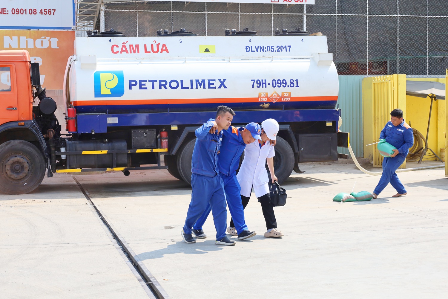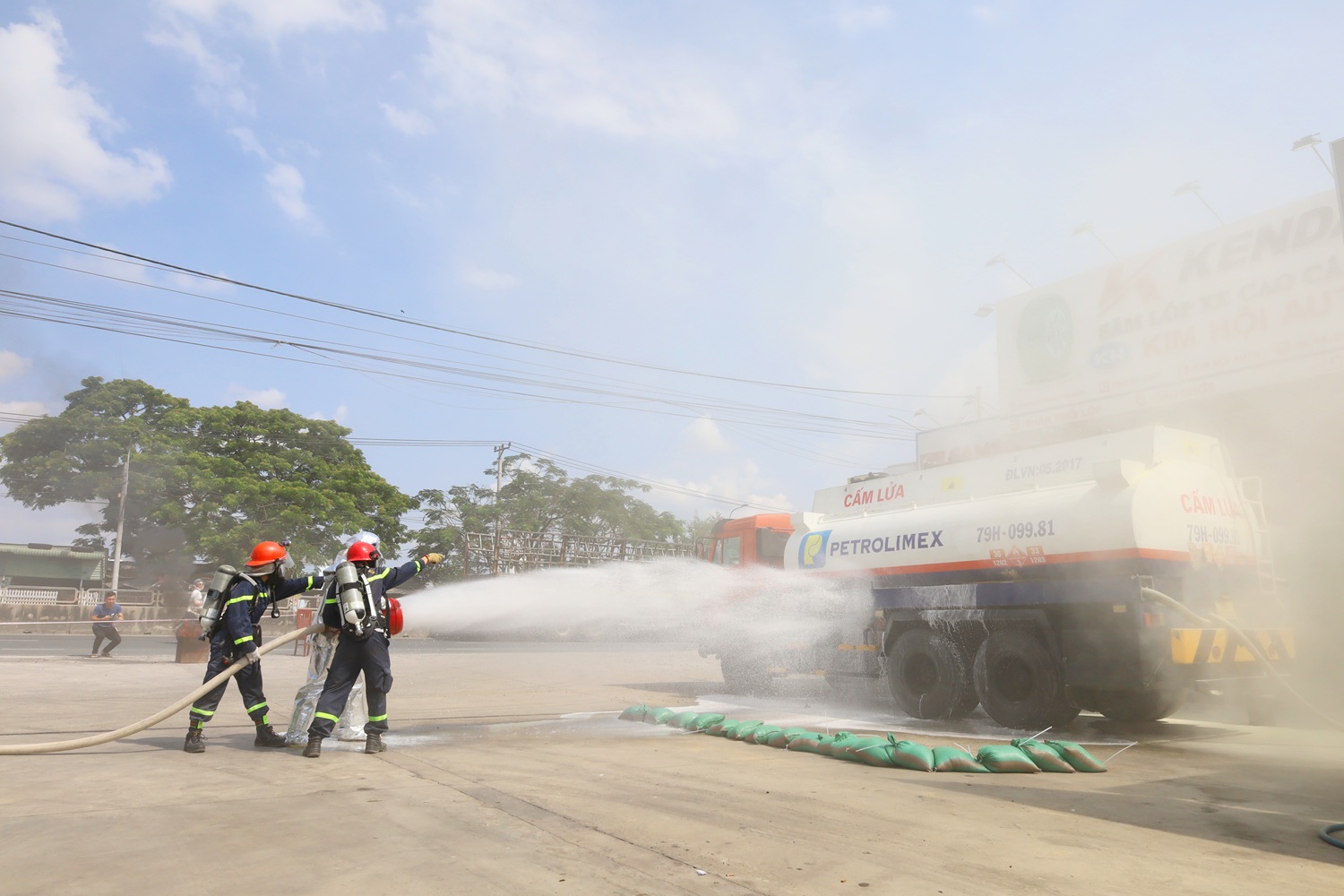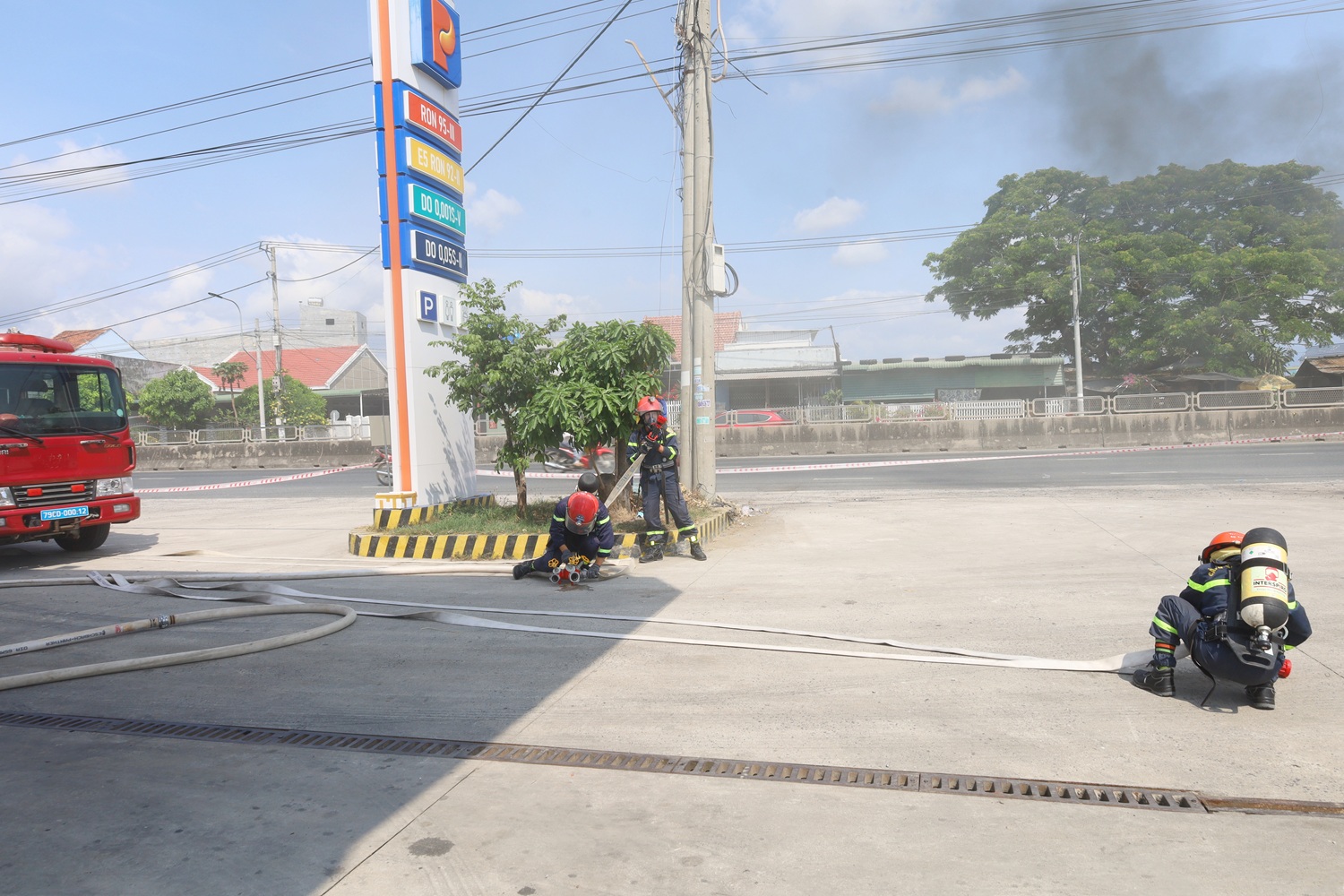 Tình huống giả định đặt ra là sự cố cháy nổ trong quá trình xe ôtô đang nhập nhiên liệu vào bồn chứa tại cửa hàng. Ngay sau khi xảy ra sự cố, thành viên Đội PCCC tại chỗ của cửa hàng nhanh chóng báo động, ngắt cầu dao điện, hướng dẫn mọi người thoát nạn; đồng thời sử dụng bình chữa cháy xách tay, mền chữa cháy để dập lửa ban đầu và gọi điện báo cháy. Lực lượng Công an phường Hòa Thắng nhanh chóng có mặt để bảo vệ an ninh trật tự. Tiếp nhận tin báo, Đội Chữa cháy và CNCH khu vực 5 đã lập tức điều động 1 xe chỉ huy, 2 xe chữa cháy cùng 11 cán bộ, chiến sĩ khẩn trương đến hiện trường; tổ chức trinh sát, cứu người bị nạn, triển khai đội hình chữa cháy bằng bọt, ngăn chặn cháy lan và dập tắt đám cháy hoàn toàn.